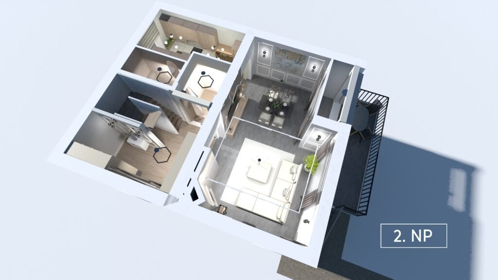 Služba obsahuje: zakreslení dispozice 2D a 3D, zakreslení kuchyňské linky a sanitárního vybavení